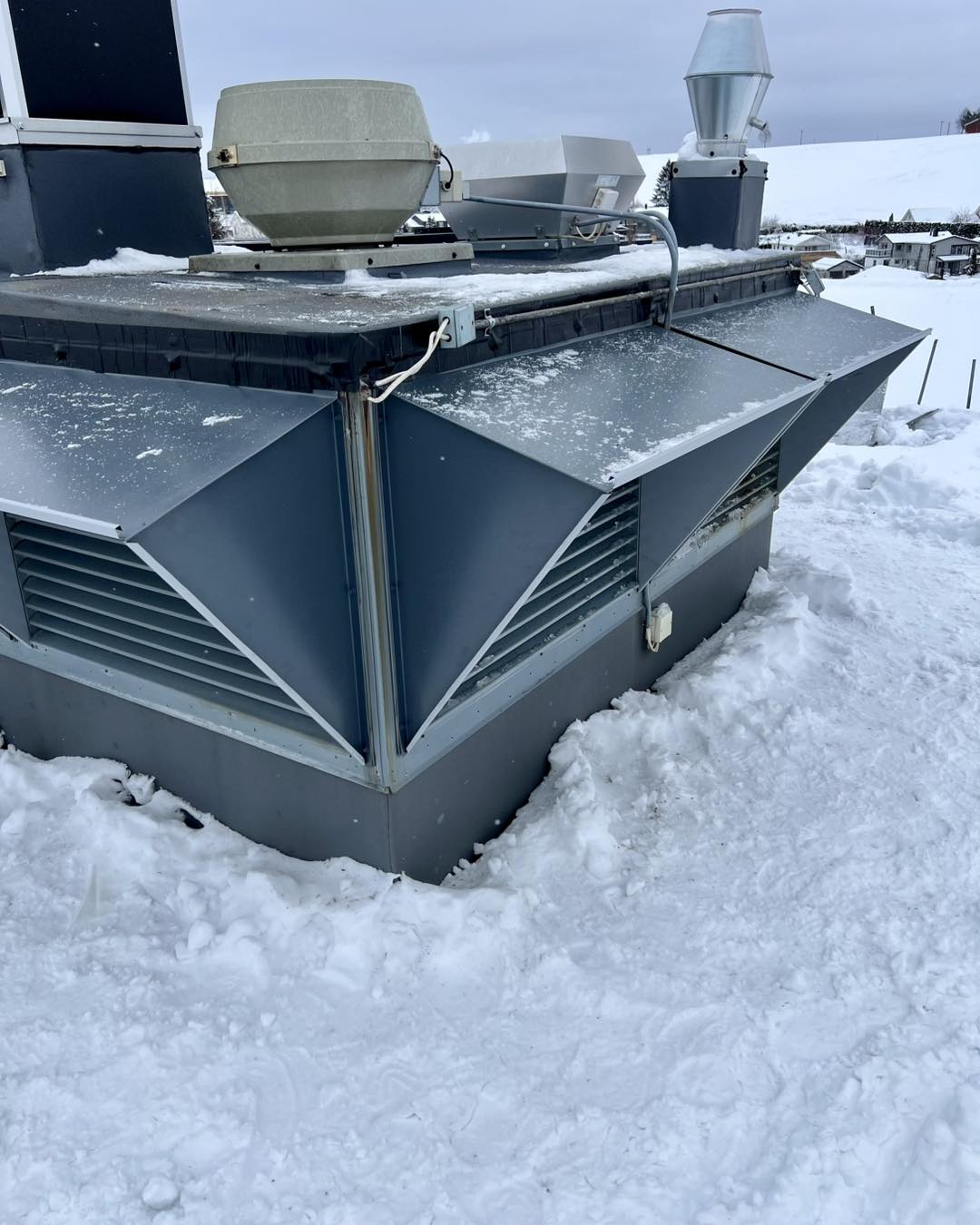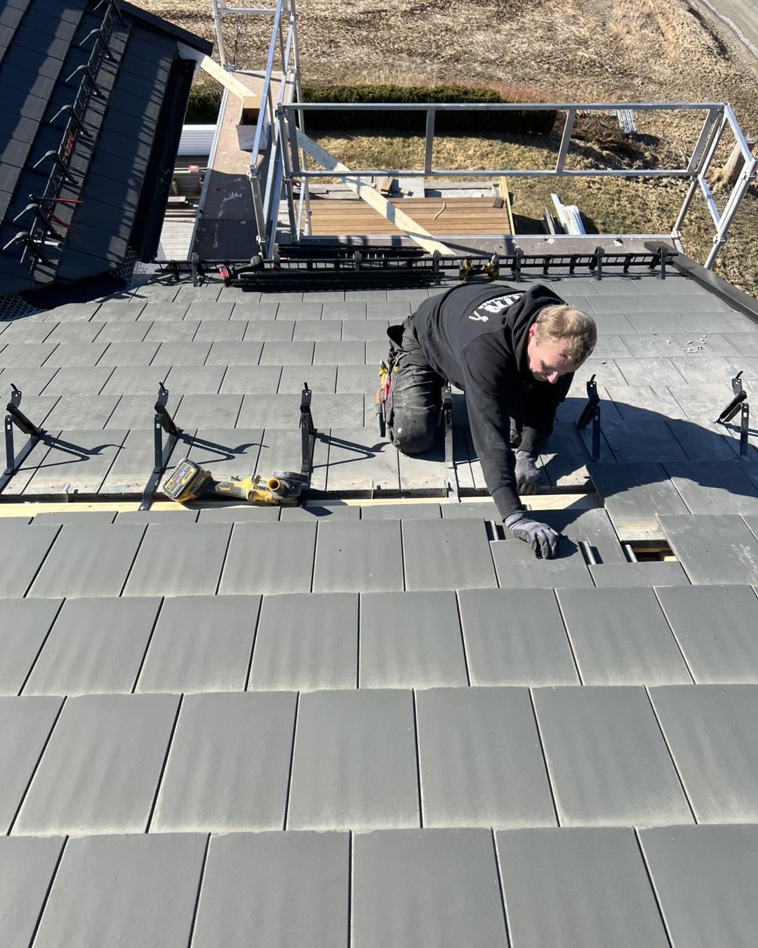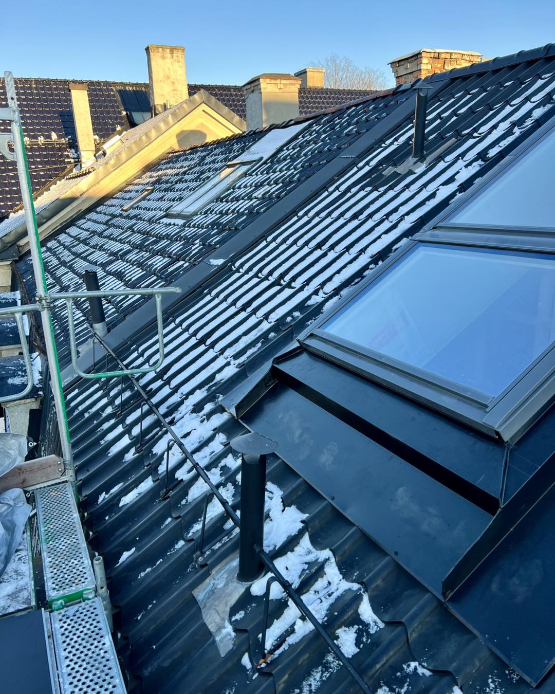 Vi monterer snøfangere, takstiger, stigetrinn og pipeplatåer. Løsninger som gir trygghet og beskyttelse hele vinteren. - Vinterarbeid